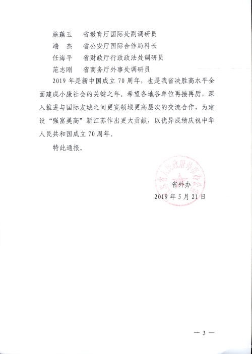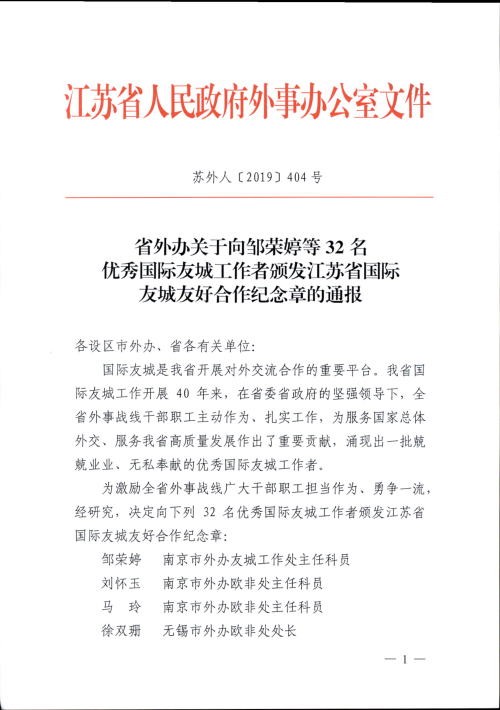 省外办关于向邹荣婷等32名优秀国际友城工作者颁发江苏省国际友城友好合作纪念章的通报