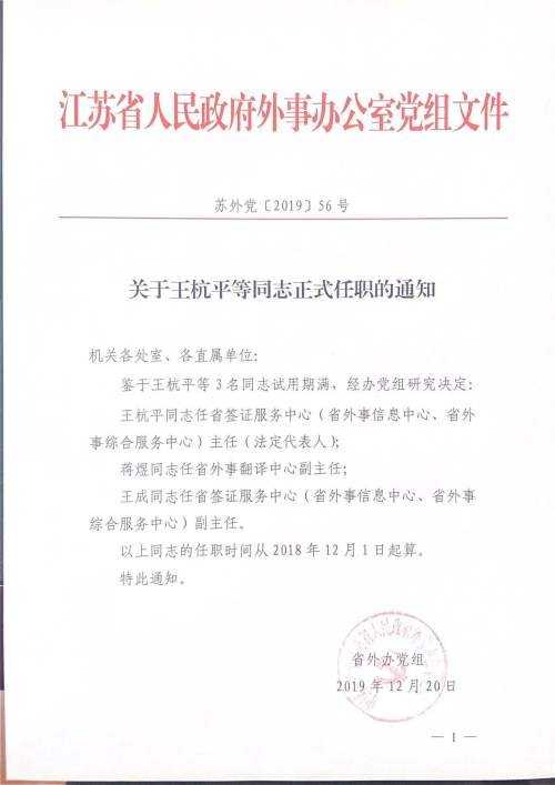 关于王杭平等同志正式任职的通知