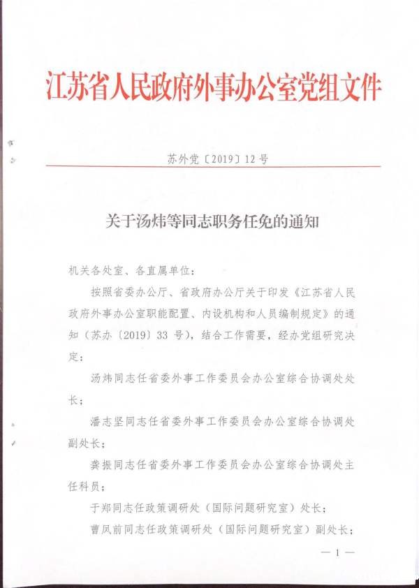 关于汤炜等同志职务任免的通知