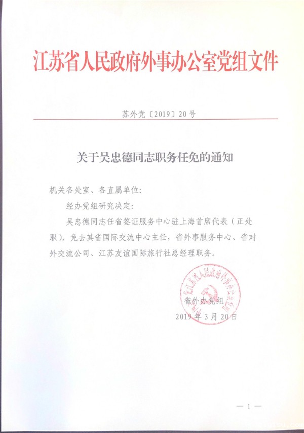 关于吴忠德同志职务任免的通知