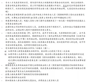 入境德国必须证明有迫切的旅行事由或有特定的旅行和停留目的(详见下文中列举的不受限类型)。在申请签证时,旅行的迫切性须得以证明。如果无法证明属于入境限令里规定的不受限的特例情况,那么您的签证申请将由于缺乏入境可能性被拒签。因此,请您务必在能证明确实属于不受限的入境类型的情况下,再提交(须缴费的)签证申请。无论入境限令是否继续执行或放宽,欧盟签证法典和德国外国人管理法都仍具有法律效力。尤其是其中规定的签证签发条件 – 即使能证明是因重要事由入境 – 仍须满足。