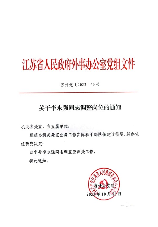 关于李永强同志调整岗位的通知