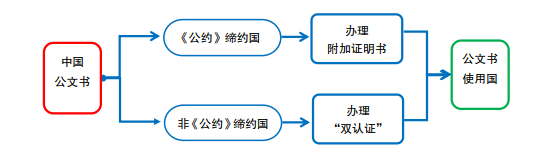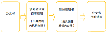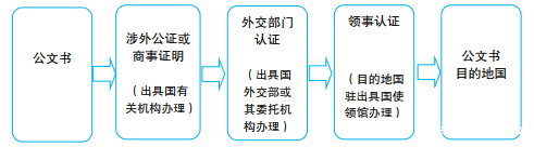 入约前,公文书送往国外使用,通常需办理出具国外交部门和目的地国使领馆两次领事认证(俗称“双认证”),流程如下图所示: