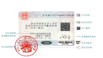 从类别看,领事认证分为国内文书的领事认证和国外文书的领事认证。外交部和地方外办负责办理国内文书的领事认证。驻外使馆、领馆以及外交部委托的其他驻外机构负责办理国外文书的领事认证。领事认证机构经过审查,为符合要求的申请文书出具领事认证书,并以领事认证贴纸的形式粘贴在申办领事认证的文书上。领事认证书内容包括领事认证书编号、领事认证证词、出具领事认证书的机构名称、领事认证签署人员的签名和出具领事认证书的日期。其样式如下: