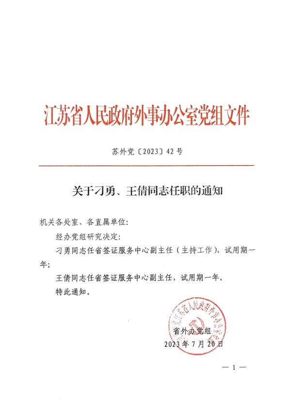关于刁勇、王倩同志任职的通知