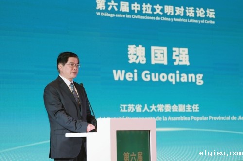 魏国强副主任在致辞中以“一辆列车”“一方土壤”“一幅绘画”3个微观视角生动叙事,宣介江苏以务实经贸合作服务中拉互利共赢、以加强生态保护国际合作推动人类命运共同体建设、以深化人文交流增进中拉友谊与互信的探索与实践。他说,习近平主席在拉共体第七届峰会的视频致辞中强调,中方愿同拉美和加勒比国家继续守望相助、携手共进,推动构建人类命运共同体,共同开创更加美好的未来。江苏当前正奋力书写中国式现代化的地方篇章,依托“中拉文明对话论坛”这一平台,江苏将持续深化中拉地方合作,书写更多文明经验互鉴、文明成果共享的精彩篇章。