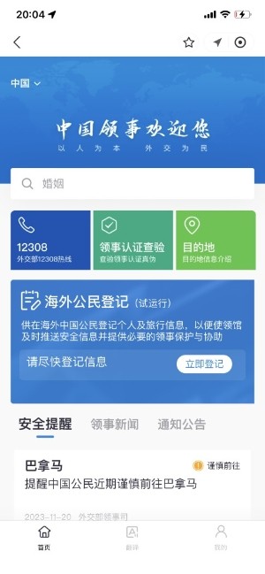 ꔷ领事保护与协助:海外中国公民如遇紧急情况,可通过“12308”模块直接拨打12308热线,一键直达外交部全球领事保护与协助服务。
