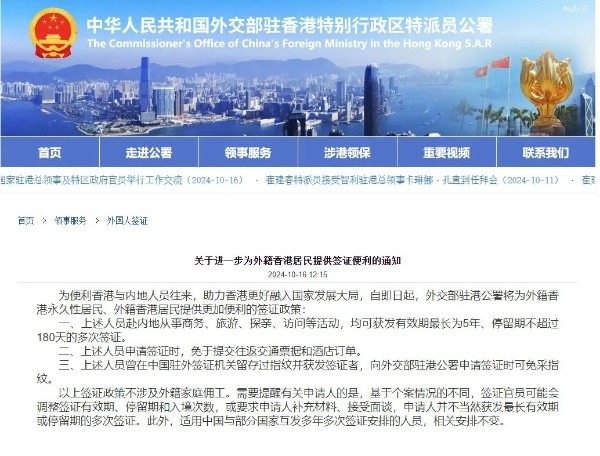 为便利香港与内地人员往来,助力香港更好融入国家发展大局,自即日起,外交部驻港公署将为外籍香港永久性居民、外籍香港居民提供更加便利的签证政策: