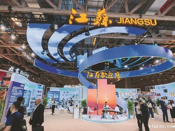 走进会场,记者一眼就看见江苏展台。远远望去,展台中心设有蓝色飘带状的巨型装置,让人联想到“水韵江苏”和“一带一路”等概念,醒目的黄色繁体“江苏”二字安放在装置顶部。“展台各处还点缀有波纹、飞檐、竹影等意象,体现江苏各地文化元素。”负责多届展台设计的江苏汇鸿国际集团有限公司设计部经理朱凌云介绍。