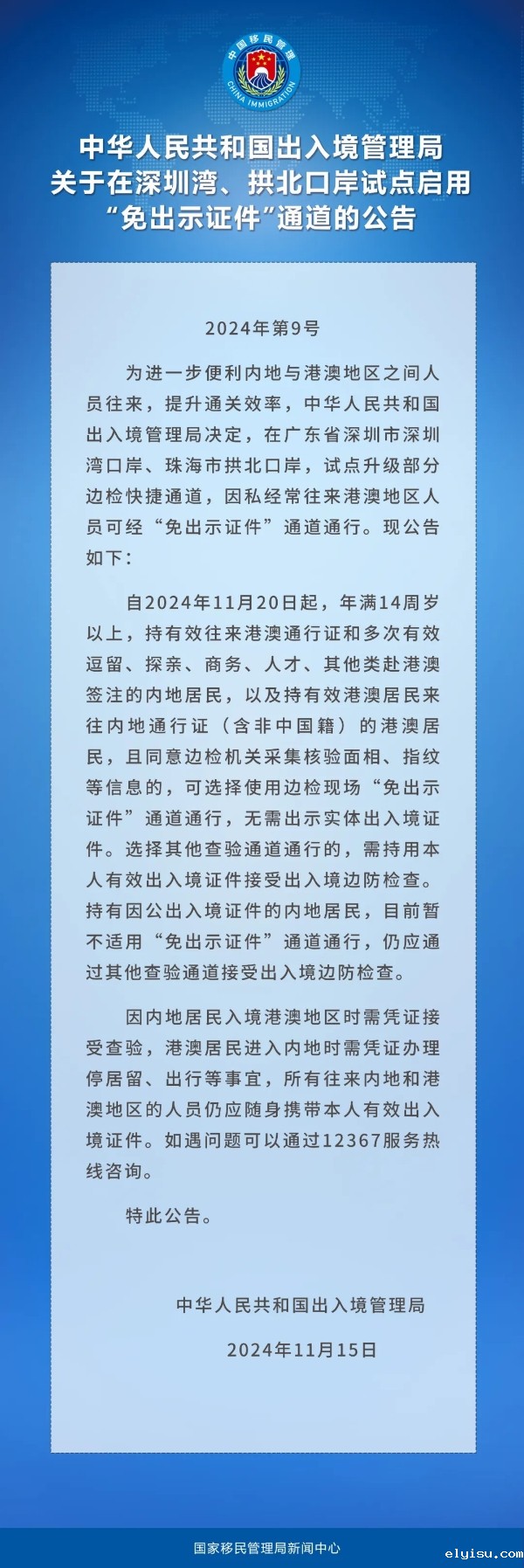 中华人民共和国出入境管理局关于在深圳湾、拱北口岸试点启用“免出示证件”通道的公告