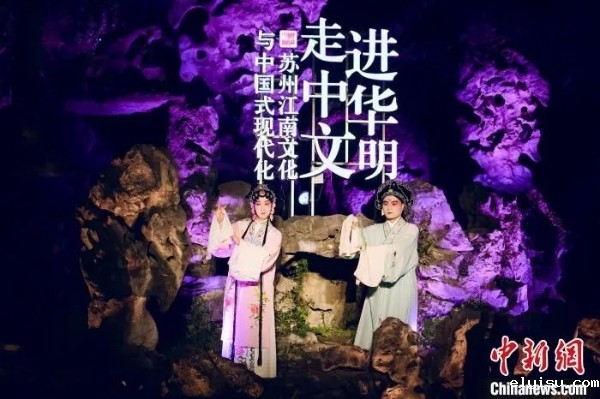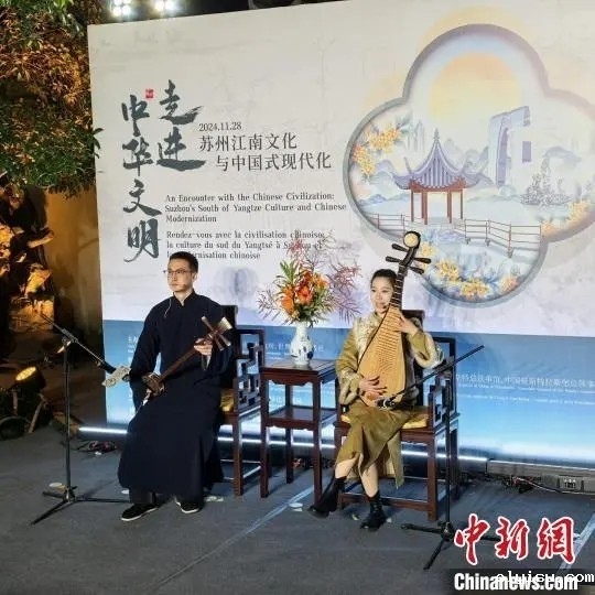 中新网苏州11月29日电 (记者 钟升)“月落乌啼霜满天……”28日夜,苏州古城华灯初上。以一曲苏州评弹《枫桥夜泊》为引,“走进中华文明——苏州江南文化与中国式现代化”主题人文交流活动在世界文化遗产狮子林拉开帷幕。