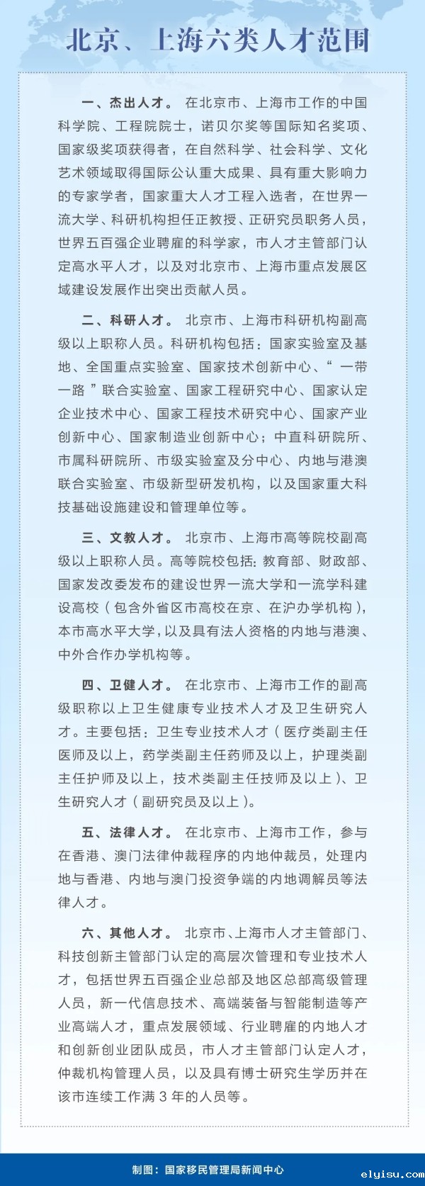 三、北京、上海六类人才可以申办赴港澳人才签注。将赴港澳人才签注政策由粤港澳大湾区内地城市扩大至北京、上海。在北京、上海工作的杰出人才、科研人才、文教人才、卫健人才、法律人才以及管理人才等六类人才,可以凭有关人才证明,单独或者同时申请办理有效期1至5年不等的多次赴香港和赴澳门人才签注,每次在香港或者澳门停留不超过30天。