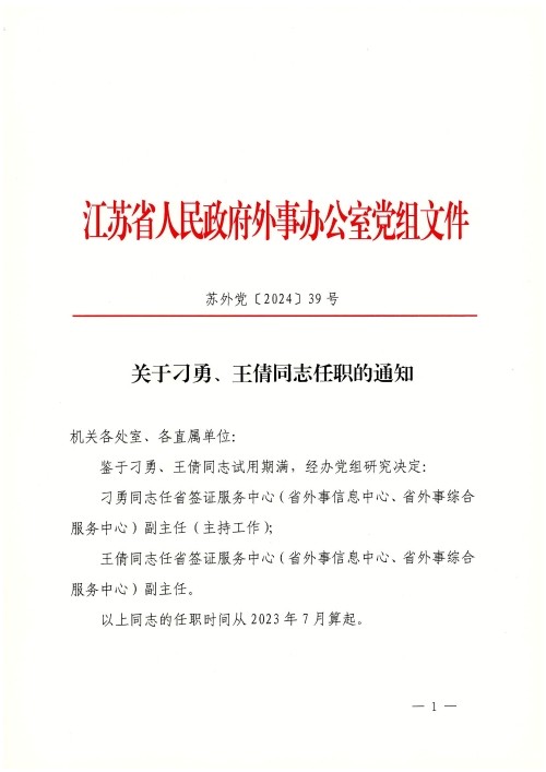 关于刁勇、王倩同志任职的通知