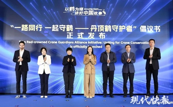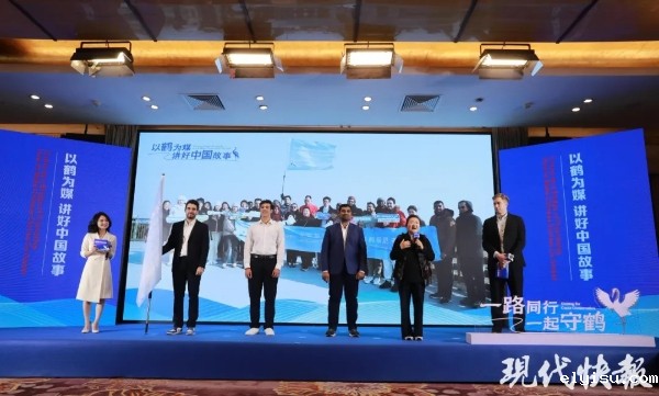 一路同行,一起守鹤。现场,12家单位联合发起丹顶鹤守护者倡议。现代快报社总编辑郑春平,江苏高校国际传播能力建设联盟副秘书长、南京大学党委宣传部副部长吴维忆,江苏盐城国家级珍禽自然保护区管理处书记、主任陈志洲,燕舞集团党委副书记、总经理王颜勤,江苏省林业局野保站副站长、江苏省野生动物保护协会理事翟飞飞,能源基金会国际合作执行主任张慧勇等发起单位代表,与国际青年代表本迪共同发布“一路同行 一起守鹤——丹顶鹤守护者”倡议书。