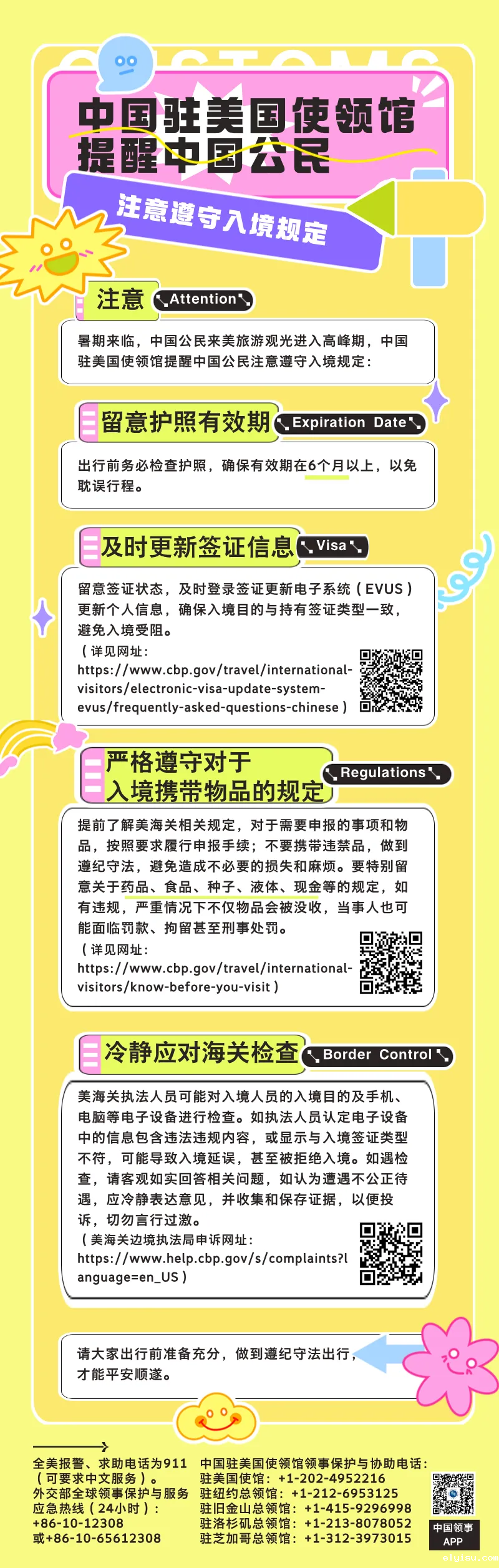 中国驻美国使领馆提醒中国公民注意遵守入境规定